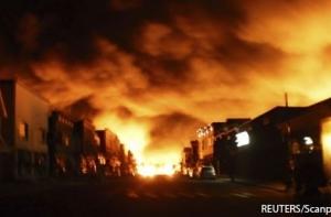 По словам очевидцев, на территории завода, принадлежащего компании Blue Rhino, произошли несколько десятков взрывов. Пламя от пожара на территории завода поднимается в высоту в несколько десятков метров.