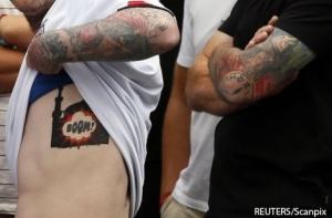 Обладателя татуировки арестовали после акции протеста, организованной Английской лигой обороны (English Defence League) в Бирмингеме 20 июля. Участвуя в митинге, мужчина сфотографировался, показав татуировку, которая располагается у него на ребрах.