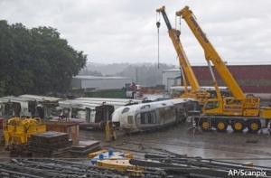 С рельсов сошли как минимум 26 из 76 вагонов состава. Как заявил губернатор штата, из некоторых вагонов происходит утечка химикатов.
