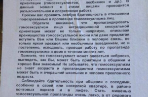 Также в объявлении сообщается, что в данном подъезде «обнаружено 1 лиц нетрадиционной сексуальной ориентации», с которыми проводится профилактическая беседа.
