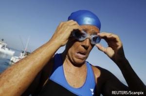 В прошлом году 64-летняя спортсменка уже предпринимала такую попытку, однако ей помешали волнения на море и ожоги от медуз.
