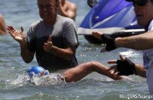 Последние три километра рядом с пловчихой идет флотилия встречающих суден. CNN ведет прямой репортаж финиша. Так что это событие можно посмотреть. Итак 52 часа 54 минуты и 18,6 сек потребовалось ей на преодоление 166 км.