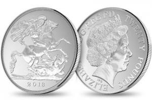 Монета будет стоить 20 фунтов (то есть цена совпадает с номиналом). На одной ее стороне изображена Королева Великобритании Елизавета II, на другой - Святой Георгий.