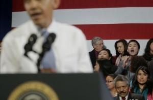 Двое молодых людей, стоявших позади президента во время выступления, посвященного пересмотру законодательства о миграции, прервали Обаму криками «Остановите депортации!».
