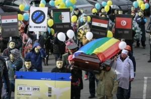 Противники евроинтеграции Украины провели в Киеве театрализованную акцию, изобразив «похороны» соглашения об ассоциации с Евросоюзом. Мужчины в масках «анонимус» пронесли гроб с воображаемым договором по улицам под аккомпанемент оркестра.