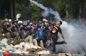 На одном из участков обороны Дома правительства, у моста через канал, ведущий к главным воротам правительственного комплекса, полиция применила помповые ружья, стреляющие массивными резиновыми пулями. Демонстранты в ответ на эти меры угнали несколько муниципальных грузовиков-мусоровозов и под их прикрытием, а также используя их как тараны, продолжают штурм.