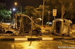 Столкновения проходили в квартале Маленькая Индия, где сконцентрированы южноазиатские магазины и рестораны. Иммигранты переворачивали и поджигали полицейские машины; пострадали несколько частных автомобилей, а также карета скорой помощи.