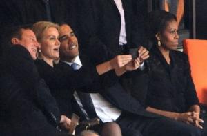 Кадр того, как политики делают «селфи» («самофото»), появился после церемонии прощания с первым чернокожем руководителем ЮАР. На нем видно, что премьер Дании пытается сфотографировать себя с Обамой и Кэмероном на свой смартфон. Президент США помогает ей настроить камеру телефона. При этом сидящая рядом супруга американского лидера Мишель Обама не принимает участие в групповом фото.
