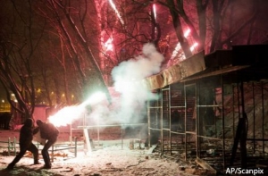 В Сети появилось шокирующее видео, на котором видно, как митингующие бросают в бойцов «Беркута» бутылки с зажигательной смесью.