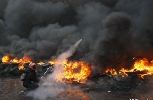 Действия протестующих и «Беркута» затруднял дым от горящих покрышек, которым была окутана улица Грушевского. При этом спецназу так и не удалось потушить пламя: участники «Евромайдана» постоянно приносили новые покрышки со стороны Европейской площади.