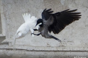 Голубей мира, выпущенных понтификом, атаковал еще и ворон. Этот момент успел запечатлеть фотограф Associated Press. Тысячи верующих по всему миру восприняли происшедшее как предзнаменование.