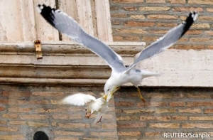 Чайка ловит голубя, который был выпущен 26 января в Ватикане Папой Франциском во время молитвы с призывом к миру на Украине.