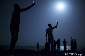 На фотографии изображены мигранты на ночном побережье города Джибути, пытающиеся с помощью телефонов поймать дешевый сигнал мобильного оператора из соседнего Сомали.