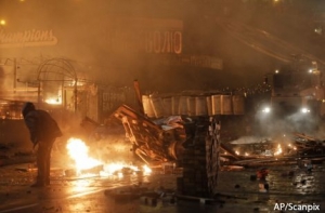 Столкновения между противниками действующей власти и правоохранителями начались в Киеве утром 18 февраля. Жертвами боев стали, по официальным данным, по меньшей мере три милиционера и семь оппозиционеров. С обеих сторон пострадали в общей сложности не менее трехсот человек. Власти Украины возложили ответственность за столкновения на лидеров оппозиции.