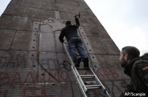 Группа «майдановцев», убедившись в прочности монумента, отправилась искать спецтехнику для его демонтажа. По состоянию на вечер, возле памятника, как сообщалось, остались лишь 10-15 человек.