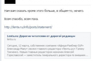 Ранее сотрудники Lenta.ru на своей официальной странице в Facebook написали: Нам вам сказать больше, в общем-то, нечего. Всем спасибо, всем пока.
