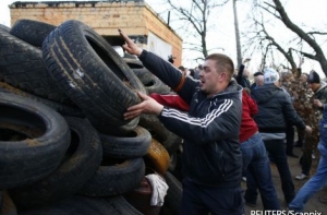 После вечернего боя за военный аэропорт Краматорска сторонники федерализации Украины продолжают блокировать выезд из аэропорта, передает корреспондент РИА Новости с места событий. Они выстроили баррикаду из покрышек около ворот аэропорта и жгут костер, чтобы согреться.