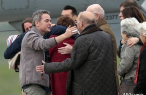 На военный аэродром Виллакобли под Парижем сотрудников радиостанции Europe 1 Дидье Франсуа и Эдуарда Элиаса, фотографа-фрилансера Пьера Торреса и репортера журнала Le Point Николя Энена доставили вертолетом с одной из военных баз на севере Франции, куда они прибыли спецрейсом из Турции.