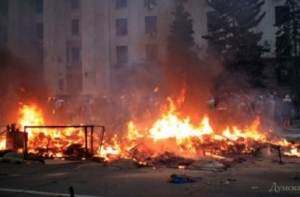 Огнем охвачены второй и четвертый этаж 5-этажного здания. Некоторые, спасаясь от огня, начали выпрыгивать из выбитых окон. Количество погибших уточняется. На земле лежит много неподвижных тел, некоторые накрыты флагами Украины. Из здания по проукраинским активистам вели прицельный огонь из огнестрельного оружия.