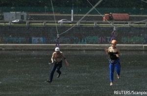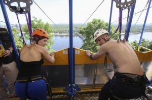 В Киеве двое молодых людей установили рекорд спуска на троллее - канате натянутом над Днепром от Арки Дружбы народов до Труханова острова, на котором желающие экстремальных чувств спускаются в альпинистской люльке.