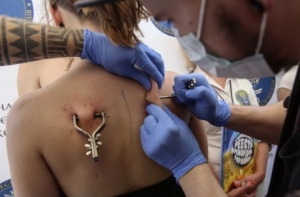 В столице Украины установили рекорд спуска на троллее с креплениями к коже спины, передает корреспондент УНН.