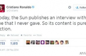 Британский таблоид The Sun подделал интервью Криштиану Роналду. Об этом сообщил сам футболист в Twitter. По словам Роналду, содержимое интервью – «чистой воды вымысел».