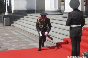 Солдат почетного президентского караула уронил ружье в то время, когда новоизбранный президент Украины Петр Порошенко проходил по красной дорожке в Верховную Раду Украины.