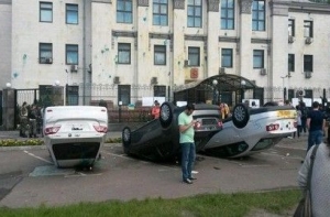 По данным «Громадське ТВ», участники акции также переворачивают припаркованные возле здания автомобили. Кроме того, демонстранты закидали яйцами, наполненными зеленкой, фасад посольства. В митинге принимают участие около ста человек.