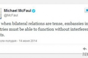 Майкл Макфол в ответ на вопрос одного из своих подписчиков в Twitter о своем отношении к «инциденту у посольства России в Киеве» заявил, что не одобряет произошедшего.