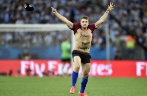 Во время второго тайма финальной встречи чемпионата мира по футболу-2014 между сборными Германии и Аргентины на поле стадиона «Маракана» выбежал болельщик в оранжевых бутсах и синих гетрах. На его груди красовалась надпись на английском языке «прирожденный пранкстер».