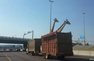 Как говорят очевидцы, один из двух жирафов, которых перевозили в открытом прицепе грузовика по скоростной трассе между Преторией и Йоханнесбургом, разбил голову о мост Гарфонтейн.