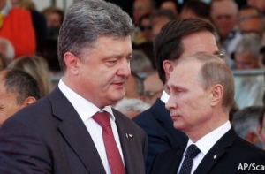 Владимир Путин и Петр Порошенко единственный раз лично встретились в начале июня во Франции, куда они приехали на празднование годовщины высадки союзников в Нормандии по приглашению главы французского государства Франсуа Олланда. Путин и Порошенко, который на тот момент уже выиграл выборы, но еще не вступил в должность, поговорили в присутствии канцлера ФРГ Ангелы Меркель. Агентство Reuters утверждает, что политики во время краткой беседы пожали друг другу руки.