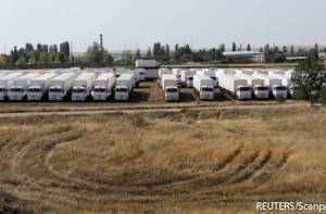 Колонна из выкрашенных в белый цвет КамАЗов находится на территории России у границы с Украиной. МИД России опасается, что колонну грузовиков на территории Украины могут взорвать. Украинская сторона накануне сообщила об уничтожении части колонны бронетехники из России. В РФ заявили, что никакой колонны на Украине нет. Сообщения украинской стороны не подтвердили и в США.