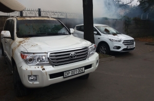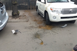 РИА «Новости» со ссылкой на пресс-службу посольства сообщает, что автомобили дипломатов облили нечистотами и краской. Радикалы также сорвали номера с машин и прокололи шины.