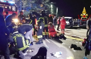 #Corinaldo (AN) #8dic 1:00, squadre #vigilidelfuoco impegnate nel soccorso in una discoteca. Forse per la dispersione di una sostanza urticante, ragazzi fuggono per il panico calpestandosi. Sei purtroppo quelli deceduti, decine feriti pic.twitter.com/NvII0jD7oe