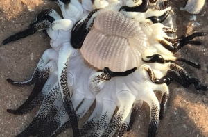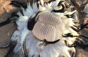 Житель города Брум в Западной Австралии Трэвис Пауэр обнаружил на пляже причудливое морское существо с десятками щупалец и гигантским ртом, сообщает Daily Express.