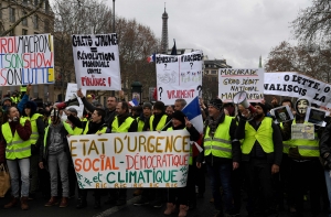 Манифестанты прошли мимо зданий Национального собрания (нижняя палата парламента), министерства финансов и вечером достигнут площади Бастилии. Участники колонны несут плакаты с требованиями к властям провести «референдум народной инициативы», многие призывают президента страны Эмманюэля Макрона уйти в отставку, протестующие поют «Марсельезу».