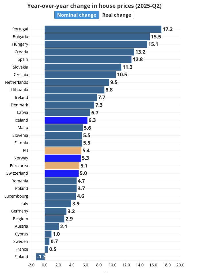 Рынок недвижимости в Евросоюзе не унимается - во втором квартале 2025-го цены на жилье подскочили на 5,4 процента по сравнению с прошлым годом. Это уже седьмой квартал подряд, когда европейцы отмечают рост в годовом разрезе, и статистика Евростата только подтверждает: номинально цены поднялись практически повсеместно, за исключением Финляндии. А если учесть инфляцию, то реальный прирост составил 2,8 процента в 21 стране из 26.