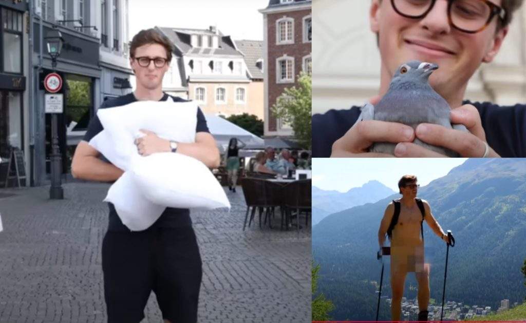 В Италии приключения продолжились испытанием «слишком громкой» обуви, а в Швейцарии он отважился отправиться в поход по Альпам полностью голым.