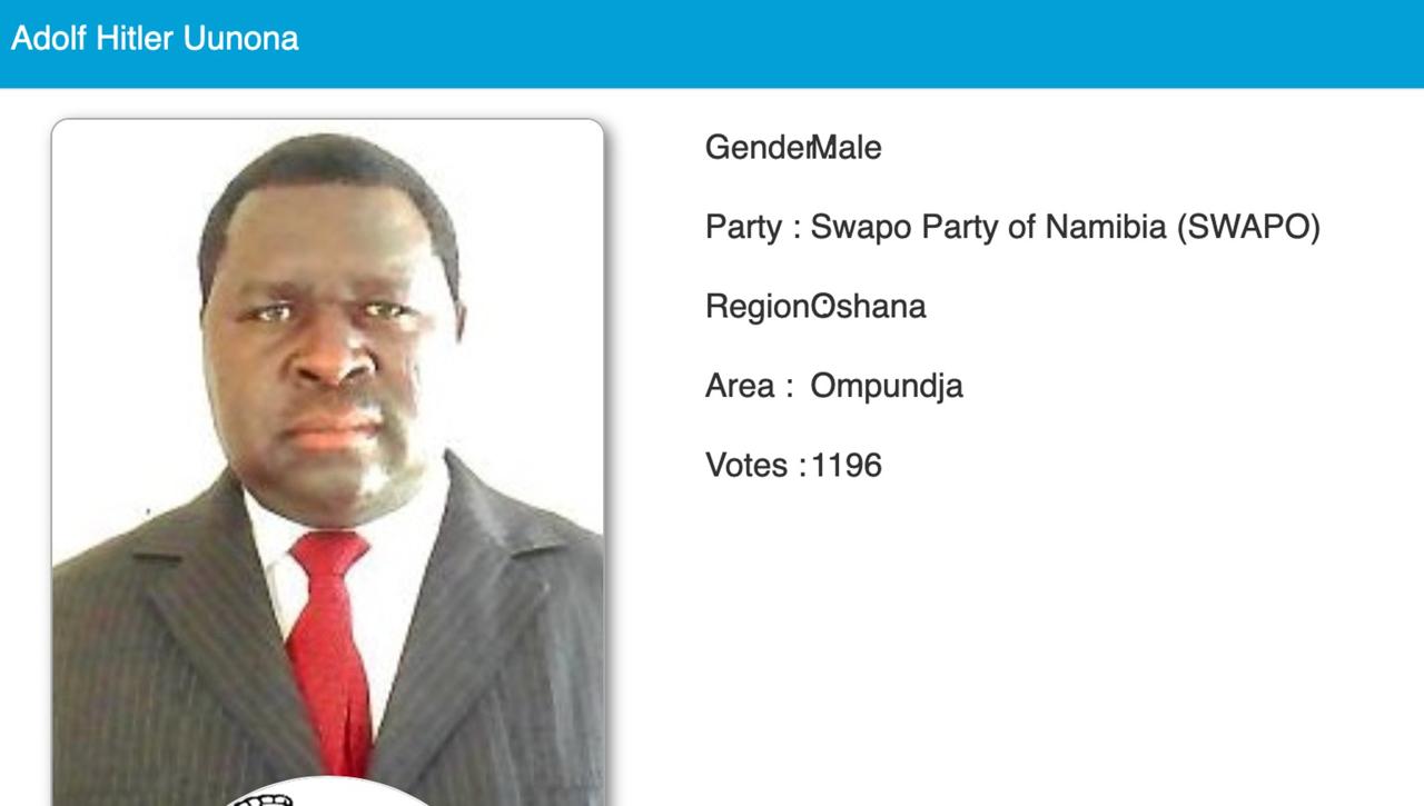 В Намибии вновь обсуждают политика по имени Адольф Гитлер Уунона - руководителя округа Омпундья, который подтвердил участие в региональных выборах, назначенных на 26 ноября. Уунона возглавляет округ уже более двадцати лет, а на выборах 2020 года получил почти 85% голосов, сообщает Bild