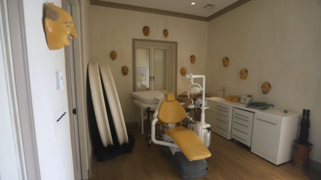 Другие кадры лишь усиливают мрачное впечатление. В одном из помещений стоит стоматологическое кресло, а стены украшены масками, похожими на лица известных исторических фигур. Показаны также спальни, кухня и настенная плитка с огромной буквой «E».