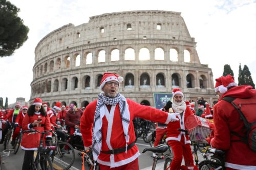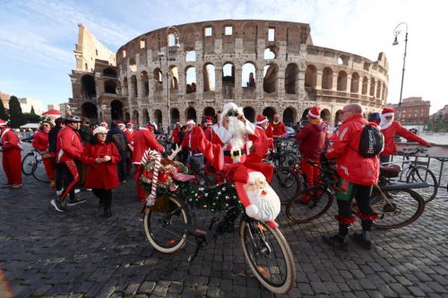 В столице Италии сотни человек в костюмах Санта-Клауса сели на велосипеды, чтобы принять участие в благотворительном веломарафоне. В этом году целью предрождественского заезда по центру города был сбор средств для детских благотворительных организаций.
