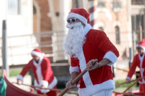 В Венеции итальянские гондольеры нарядились в костюмы Санта-Клаусов, чтобы провести праздничную регату, соревнуясь в том, кто быстрее проплывет по Гранд-каналу. И это тоже многолетняя традиция города.