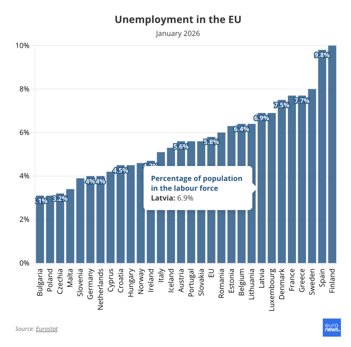 Самая сложная ситуация традиционно сохраняется на юге Европы: в Испании (9,8%) и Франции (7,7%). Напротив, Италия показала результат в 5,1%, существенно опередив латвийские показатели.