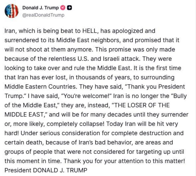Трамп также прокомментировал слова президента Ирана Масуда Пезешкиана, который извинился перед соседними странами за атаки по ним и пообещал больше не наносить по ним удары. По мнению президента США, таким образом Иран «сдался своим ближневосточным соседям».