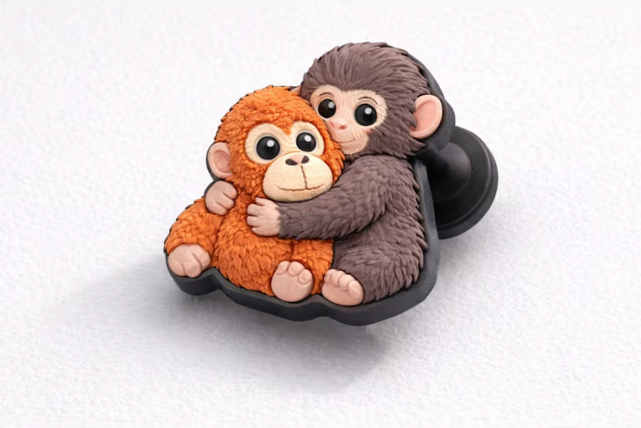 Дизайн брелока изображает Панча, обнимающего оранжевую игрушечную обезьянку из IKEA. Именно к ней примат привязался, после того как его бросила мать.