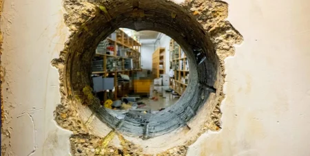 Лишь два дня спустя – в 3:58 утра в понедельник, 29 декабря – второй пожарный сигнал вызвал экстренные службы обратно в пустующее отделение Sparkasse. То, что обнаружили полиция и пожарные на этот раз, было поистине кинематографичным. В железобетонной стене архивного помещения, примыкающего к главному хранилищу, зияла дыра диаметром 40 см.