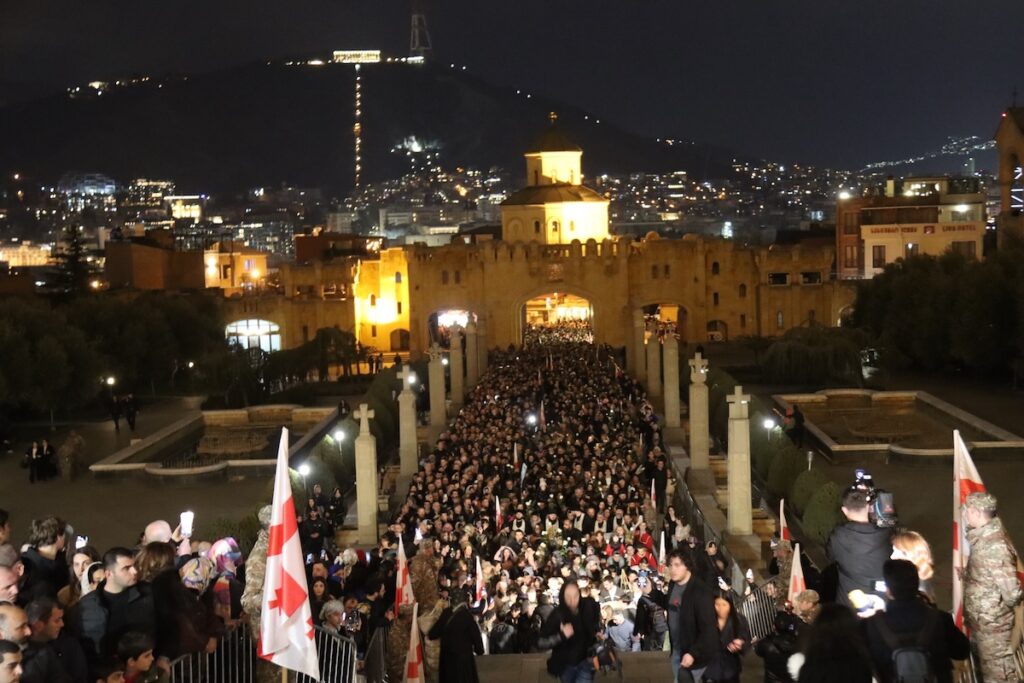 В это время у собора собрались сотни верующих. Из-за наплыва людей и повышенных мер безопасности доступ туда ограничен - внутрь допускались только лица со специальными разрешениями. В центре Тбилиси действовали ограничения движения. По всему городу на зданиях были вывешены экраны, на которых транслировались кадры из жизни патриарха.