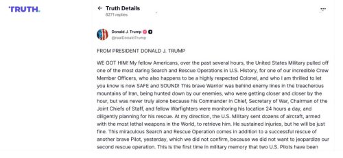 Президент США назвал произошедшее беспрецедентным случаем: по его словам, впервые в истории были спасены сразу два американских пилота, оказавшихся «в глубине враждебной территории», причем операции проводились отдельно.