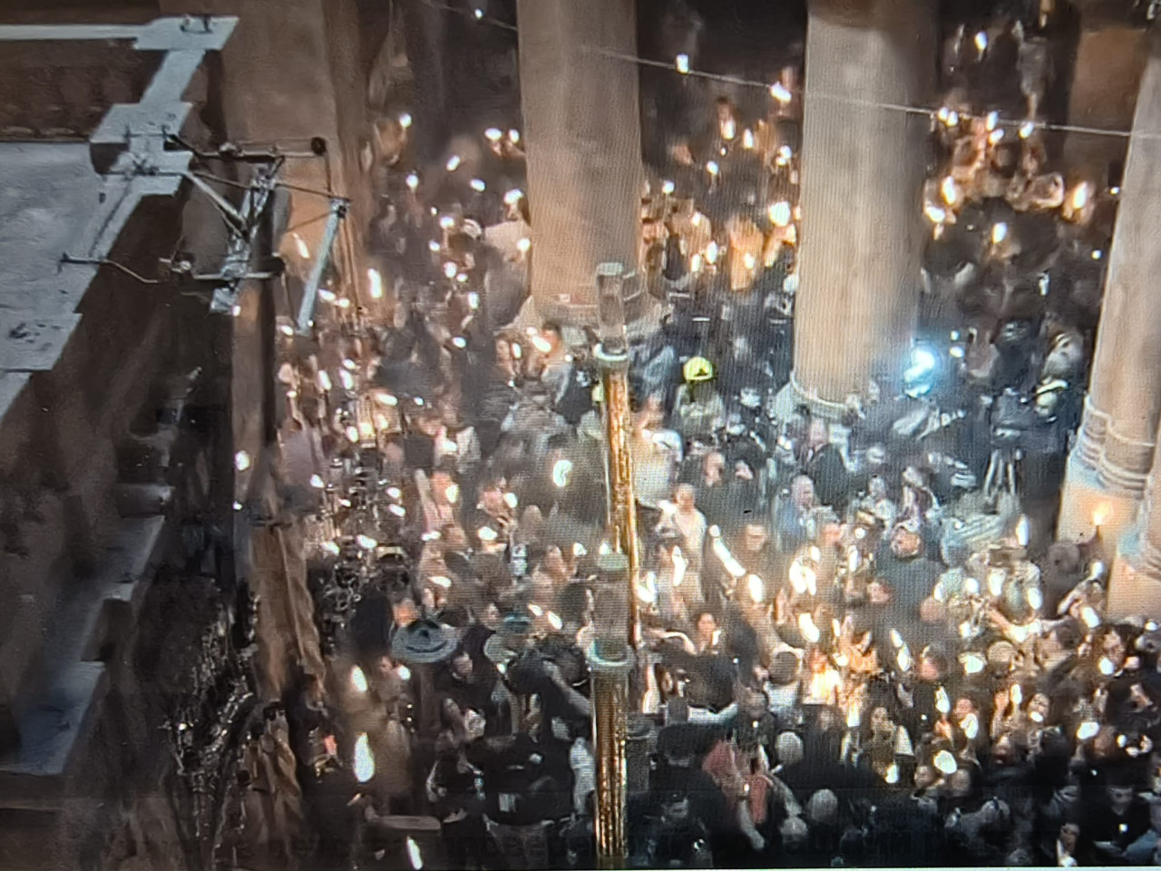Патриарх Иерусалимский вынес из Кувуклии 33 зажженные свечи, символизирующие количество прожитых лет Иисуса Христа на земле. Прямо сейчас Благодатный огонь передают присутствующим в Храме Гроба Господня представителям православных конфессий, который они развезут спецрейсами по разным странам.